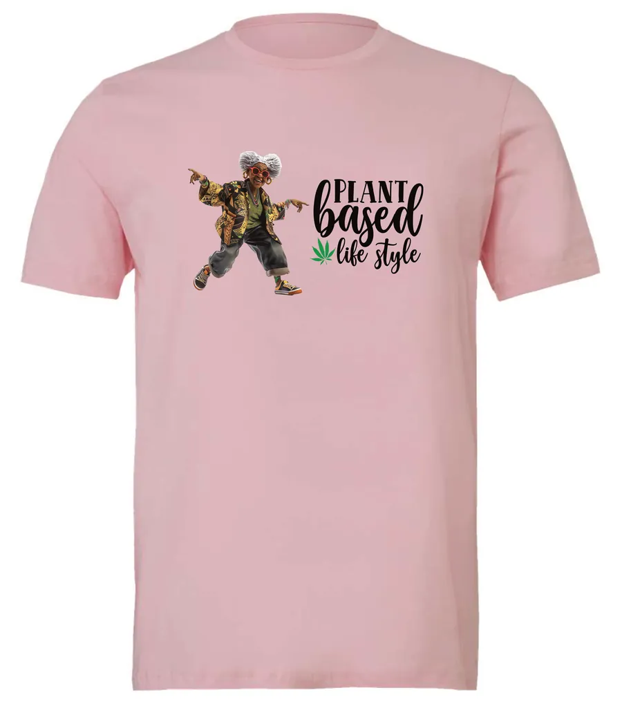 white marihuana v-neck t-shirt featuring a black old woman dancing and it says plant based life style